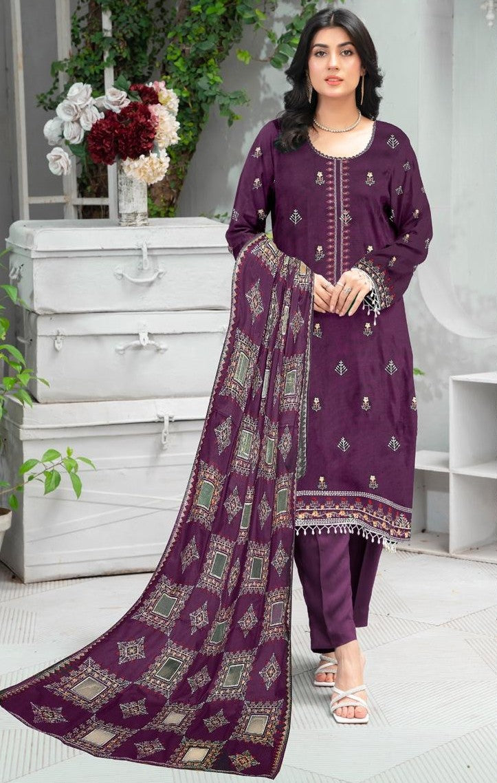 This 3-piece luxury suit features heavy embroidery on premium fabric, paired with a beautifully embroidered aplik shawl for a royal touch.