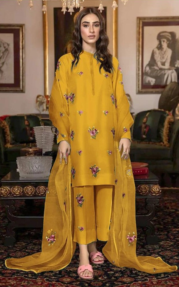 Step into elegance with this luxurious 3-piece Shamooz Silk outfit, delicately all-over embroidered to perfection. Paired with a beautifully embroidered organza dupatta, this design blends timeless grace and winter comfort. Perfect for formal gatherings, festive evenings, and special occasions, this attire ensures you shine with sophistication all season long.